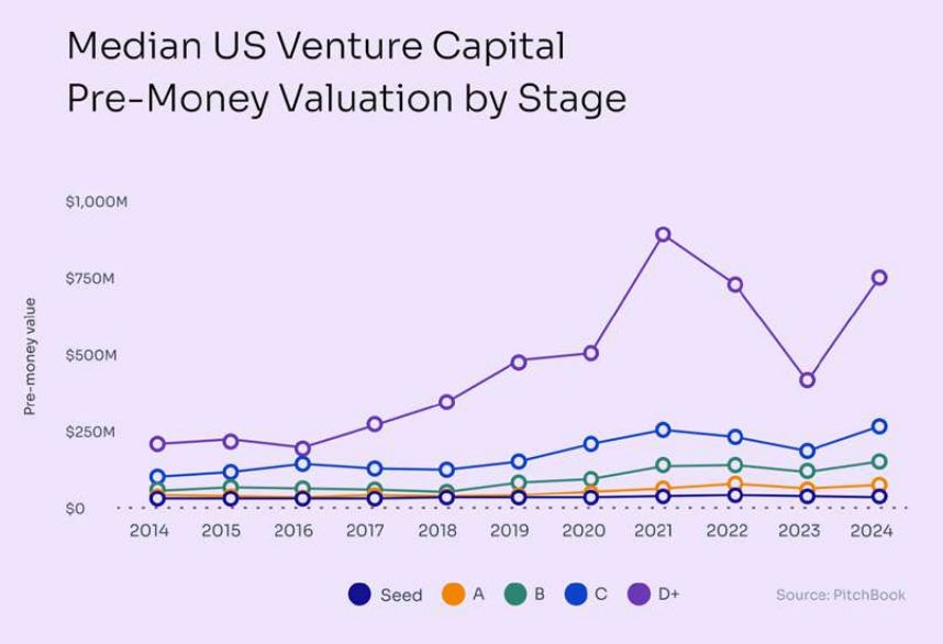 Pre-money valuations across all stages increased in 2024. Median valuations at the seed and Series A stages each increased by approximately 25% and reached decade highs of $14 million and $40 million, respectively. While Series B valuations likewise increased year-over-year, the 42% and 112% increases at the Series C and Series D+ stages, respectively, were most notable, reflecting investors’ enthusiasm for standout companies with proven traction and growth, and opportunities with clear scaling potential.